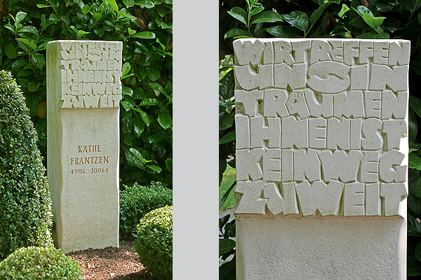 Hochkant stehende Gedenksteine, die trotz geringer Breite eine große Gestaltungsmöglichkeit für Ornamentik und Schrift bieten.
